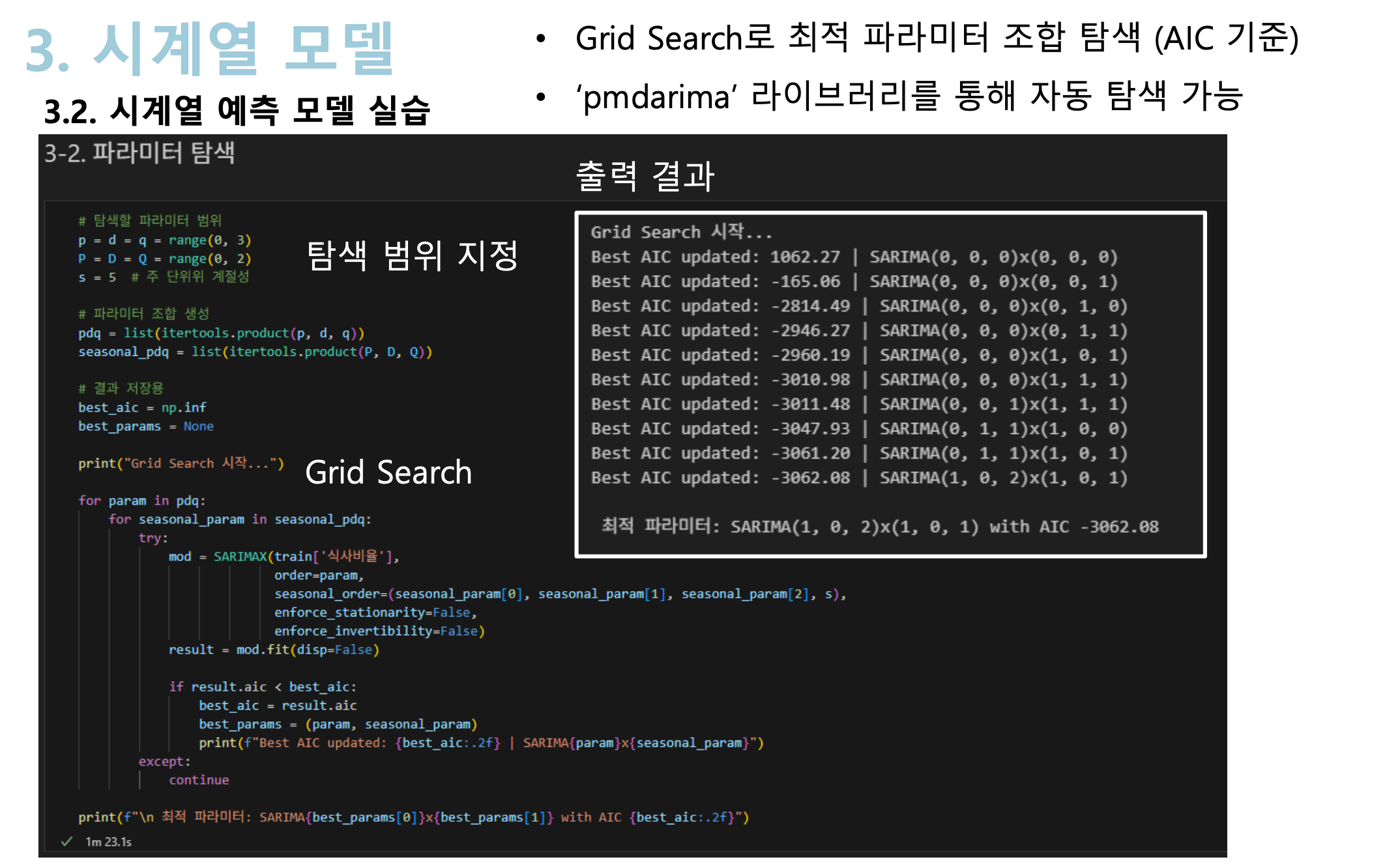 그리고 탐색 범위를 지정함. p, d, q를 예측하기 위해서 여기서는 그래서 그 이들 설치를 통해서 찾는 과정을 구하는 코드 사용했음.