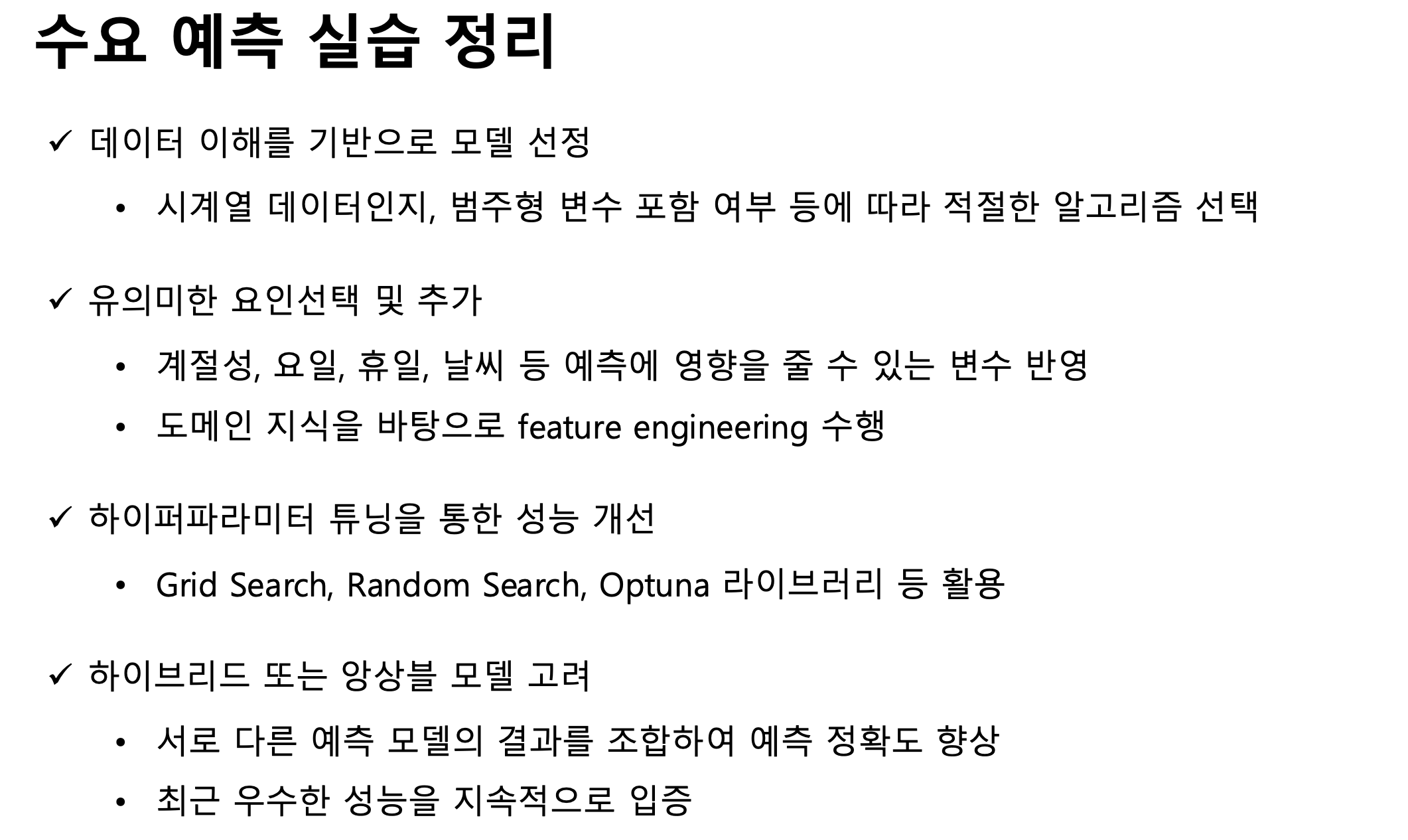 한가지 방법보다는 몇 가지 방법을 보고 서로 비교해서 어떤 방법이 이 데이터에 대해서 수요 예측을 잘 하는가를 찾아내는 것도 굉장히 좋은 방법이라고 생각한다.