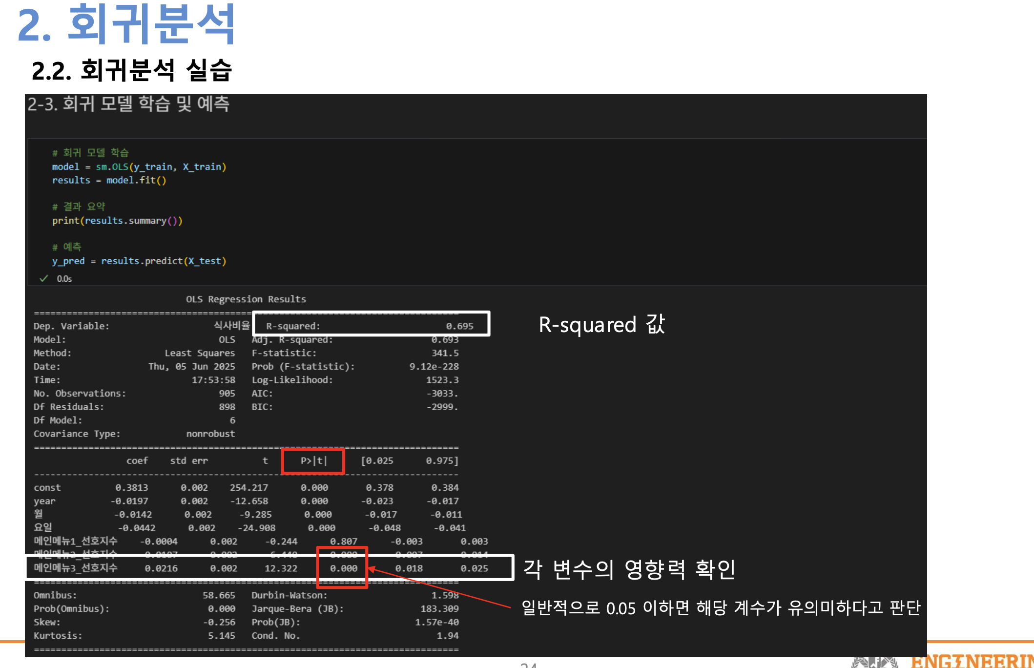 그리고 변수의 영향력인 p 값이 0.05 이하이면 해당 계수가 유의미 하다고 판단. 각 종속 변수의 유의미한 정도를 이 결과표를 보고 확인 할 수 있음.