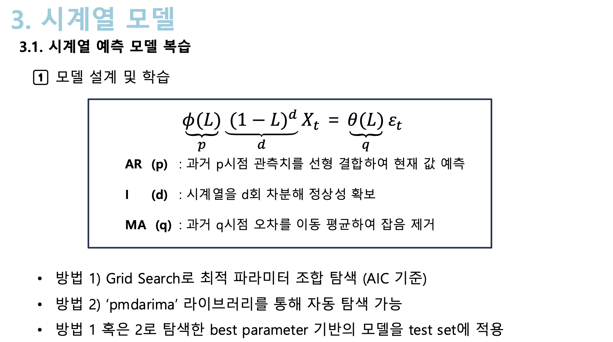 Grid Search를 쓰기 위해서는 p, d, q의 범위, 최소값과 최대값을 주고 그 범위내에서 최적의 조합을 찾아 내라고 하는 것이다.