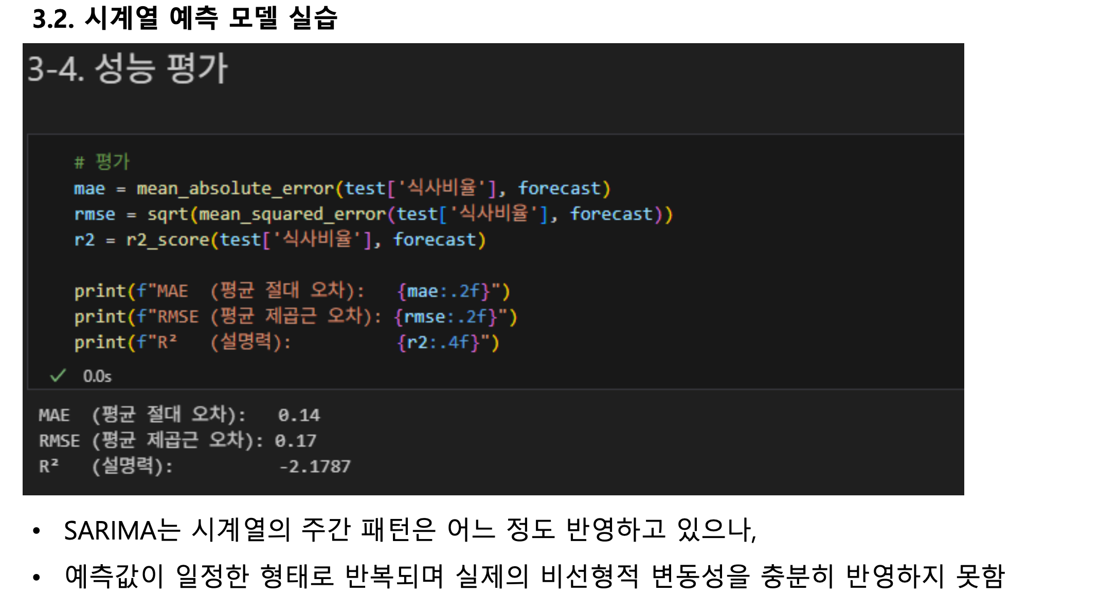 그 이유는 SARIMA는 시계열의 주간 패턴은 어느 정도 잘 예측 하고 있으나 예측값이 일정한 형태로 반복 되며 실제의 비선형적 변동성을 충분히 반영 하지 못했기 때문이라고 평가 하고 있음.