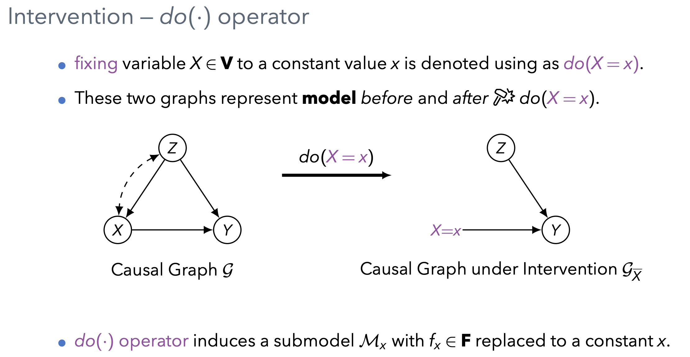 X라는 변수를 고정 하기 위해 개입을 한다면 X라는 변수는 더 이상 Z와 같은 모르는 교란 요인들들에게 영향을 받지 않고 상수 X로 고정되기 떄문에 원래 있던 오른쪽과 같은 그래프에서 엣지를 지우는 것으로 이해할 수 있음.