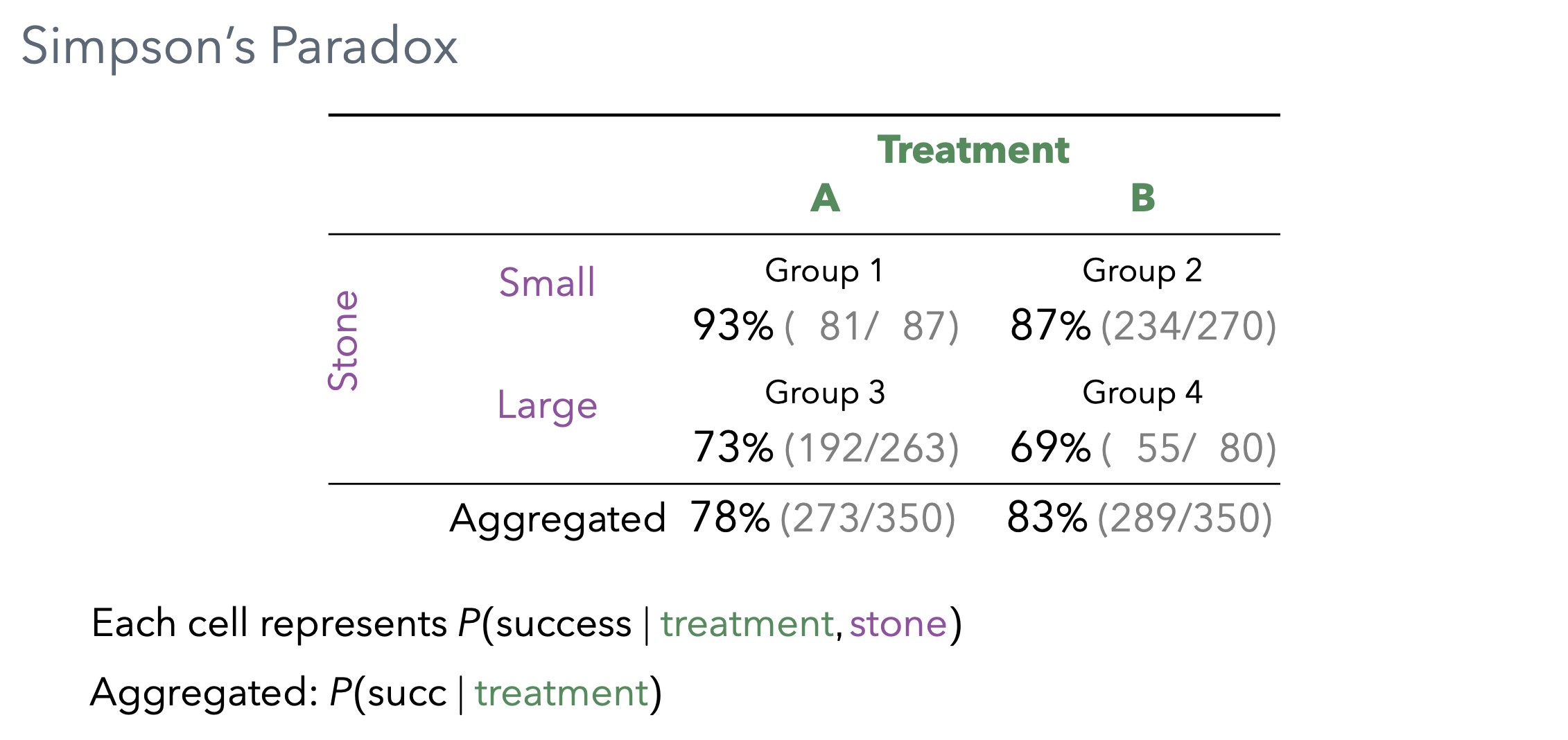 - 교란변수(confounder)인 "결석 크기"를 고려하지 않으면 인과적 효과를 잘못 해석함