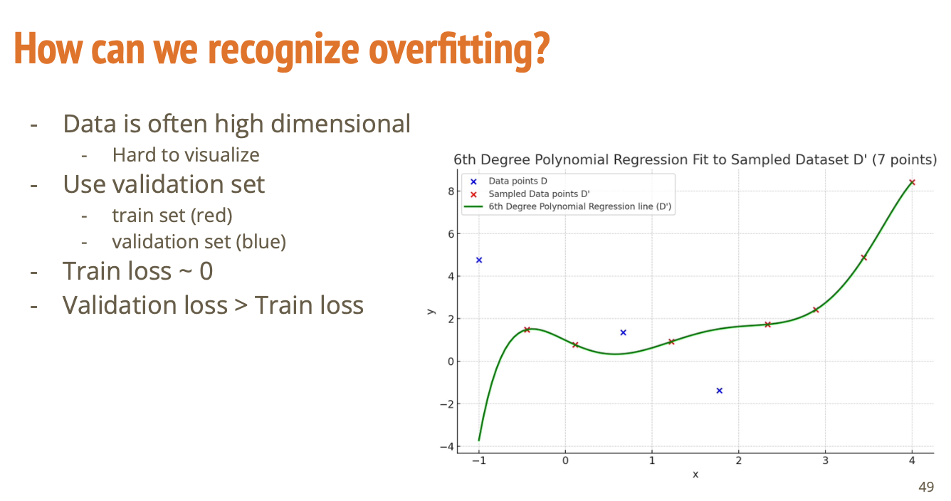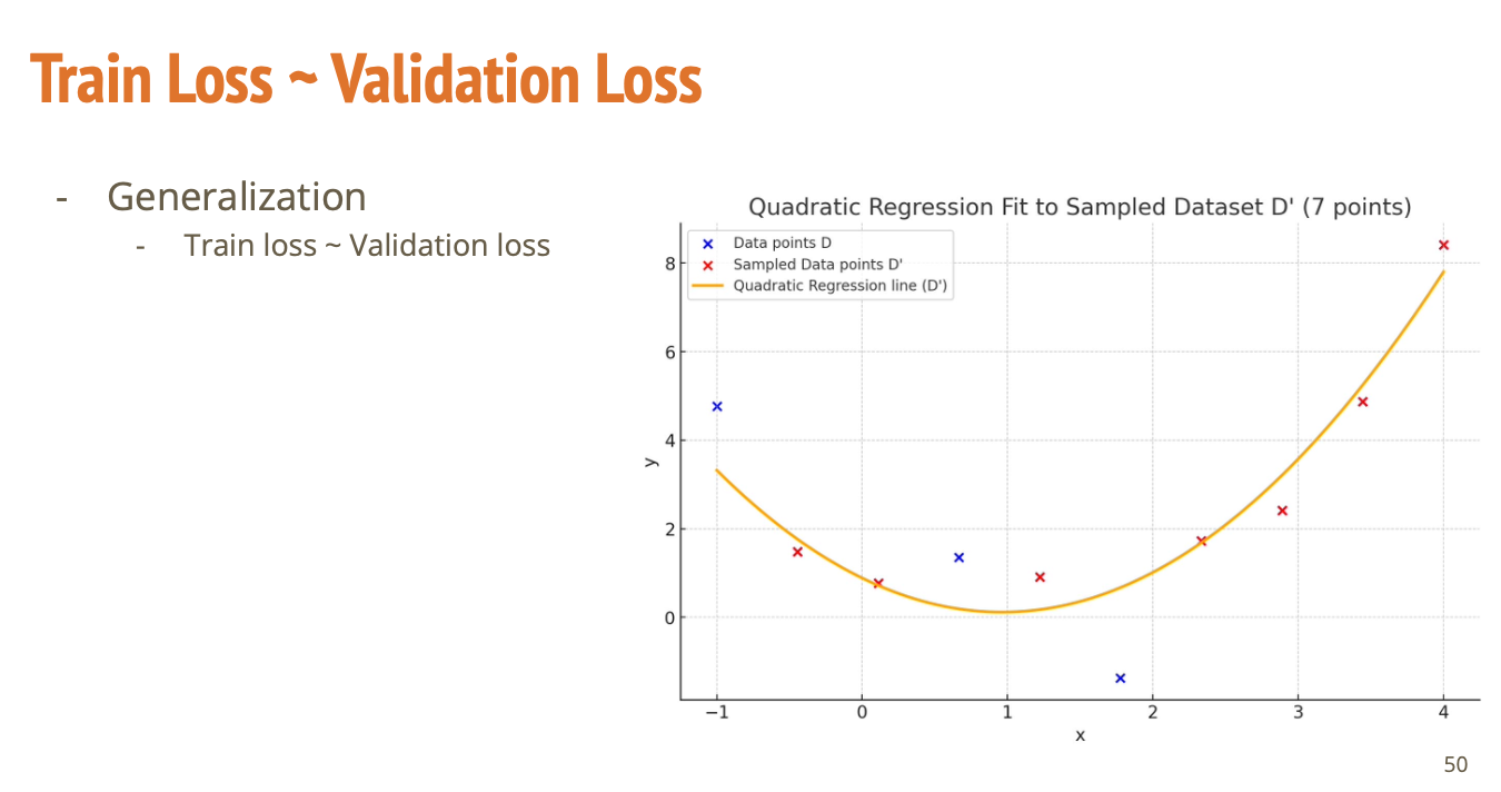 빨간색 점들 7개의 데이터만 사용하는 경우를 생각해보자. 그랬을 때 범용적으로 잘 적용이 되고, 데이터에 특별하게 오버피팅이 되어있지 않다고 한다면 이 일곱 개의 데이터를 가지고 계산하는 손실과 내가 train에 사용하지 않았던 데이터에 적용하는 손실 값의 간극이 그렇게 크지 않을 것이다.