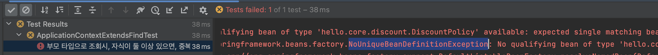 NoUniqueBeanDefinitionException 이라는 오류가 납니다. 조회되는 bean은 두 개인데, 반환 값은 bean 한 개였죠.