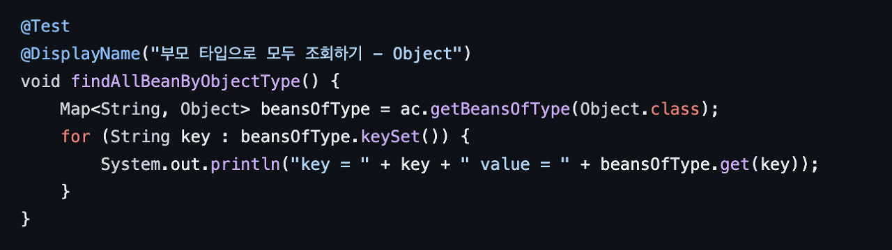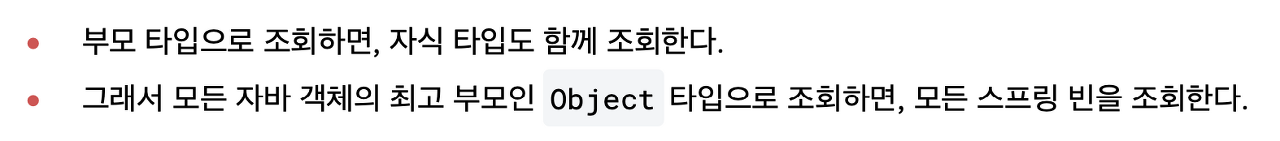 그래서 모든 Java 객체의 최고 부모인 Object type으로 조회하면, 모든 스프링 빈을 조회합니다.