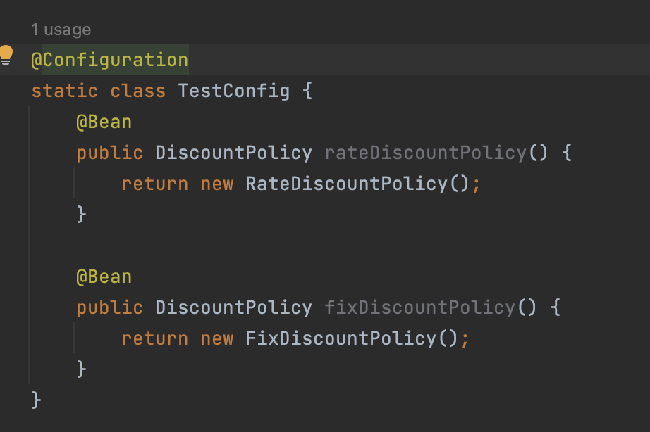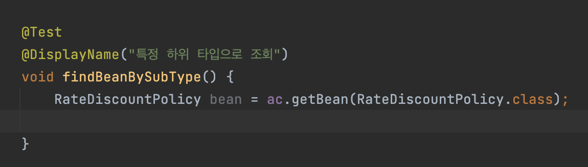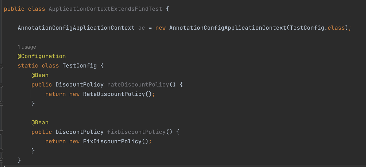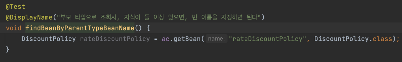 이렇게 하면, DiscountPolicy 타입으로 조회했을 때, 자식 타입인 RateDiscountPolicy와 FixDiscountPolicy가 조회될 겁니다.