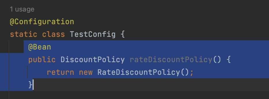이제 @Configuration을 만들어야 하는데, 이번에도 static class로 TestConfig 라는 설정 정보를 만들겠습니다. 빈은 두 개를 등록할겁니다.