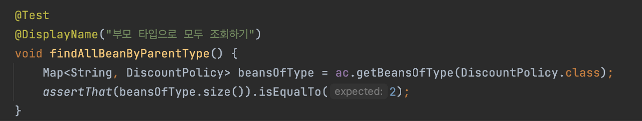 여기서 지금 DiscountPolicy 타입이 2개가 있습니다. 그런데 DiscountPolicy이라는 부모 타입으로 조회했기 때문에, 자식 인스턴스 두 개가 다 걸려들죠. 그래서 둘 다 조회가 됩니다.