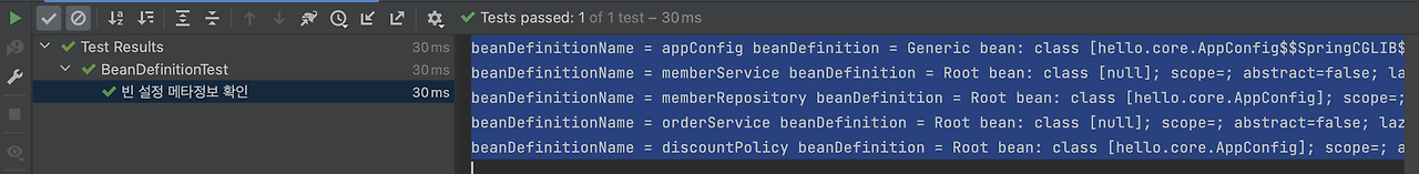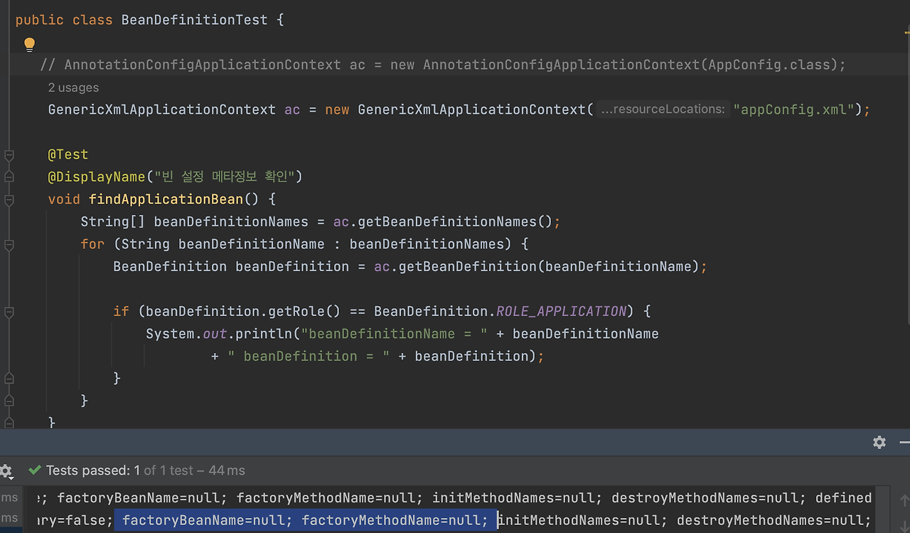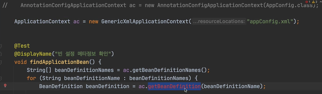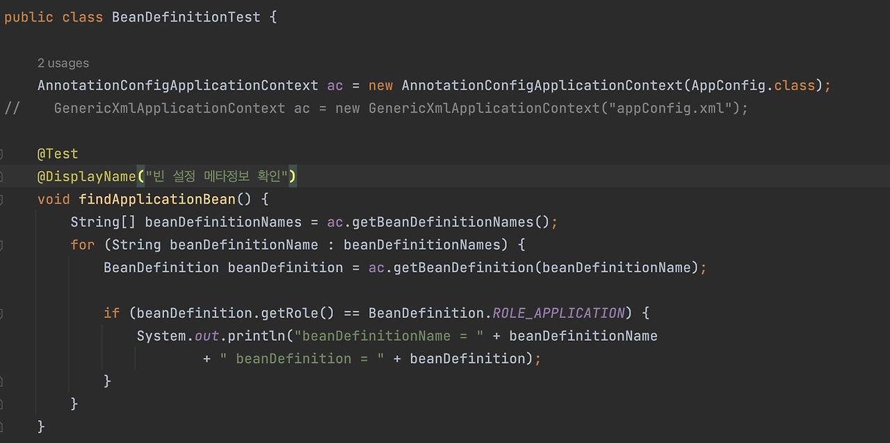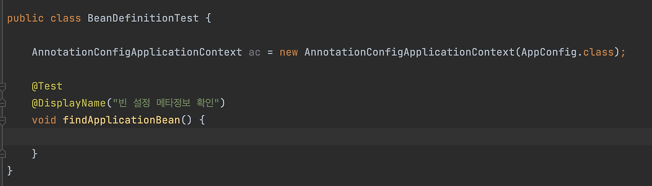 이렇게 스프링 컨테이너를 만들고, 빈 설정 메타정보 확인이라는 Test를 만들겠습니다. BeanDefinition을 확인하는 테스트예요.
