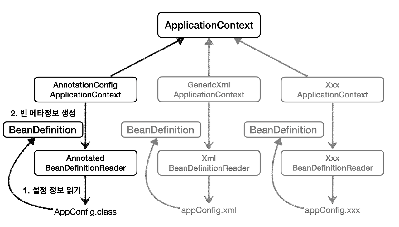 그래서 그림상 스프링 컨테이너 자체는 BeanDefinition에만 의존해요. 스프링 컨테이너는 BeanDefinition이 클래스로 설정된 정보인지, XML로 설정된 정보인지, 아니면 임의로 설정된 건지는 상관을 안하는 거예요.