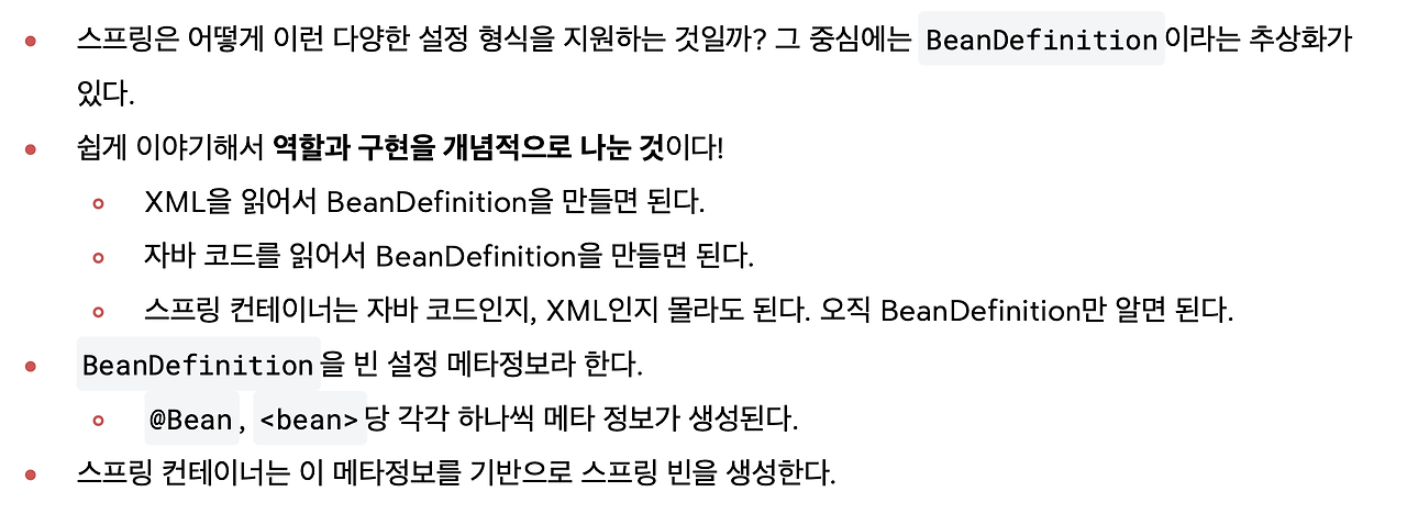 스프링 컨테이너 입장에서는 이게 Java 코드인지 XML인지 몰라요. 오직 BeanDefinition만 알면 돼요. 그걸 기반으로 빈을 생성하고 다 하는 거예요.