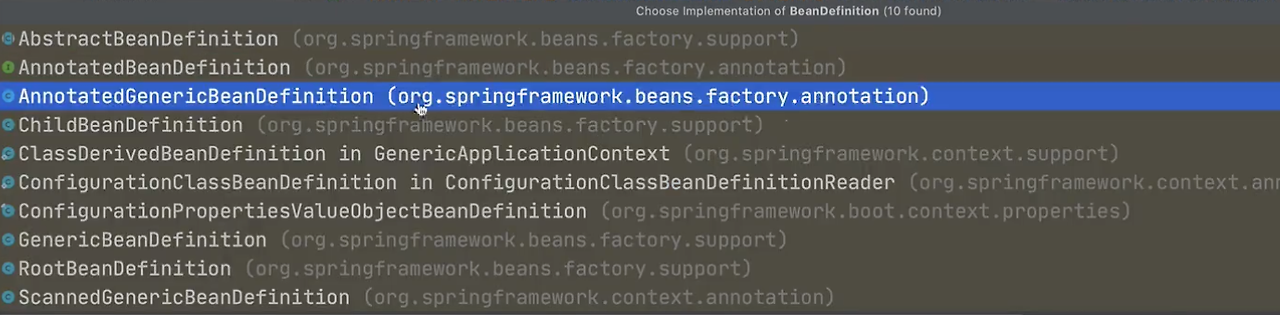보시면, BeanDefinition 자체가 인터페이스에요. 인터페이스니까 구현체가 있겠죠?