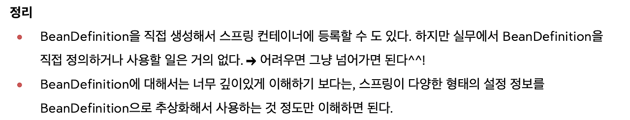 하지만 실무에서 BeanDefinition을 직접 정의하거나 사용할 일은 거의 없습니다.