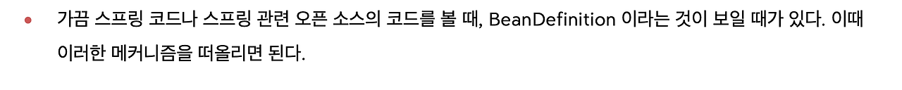 그런데 가끔 스프링 코드나 스프링 관련 오픈 소스의 코드를 볼 때, BeanDefinition 이라는 것이 보일 때가 있습니다. 이때 이러한 메커니즘을 떠올리면 돼요.