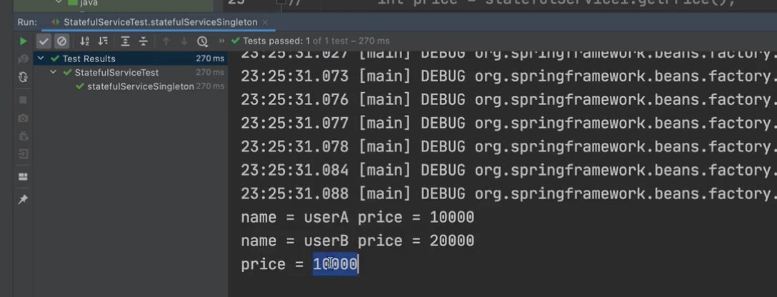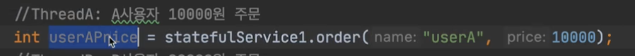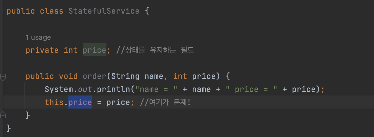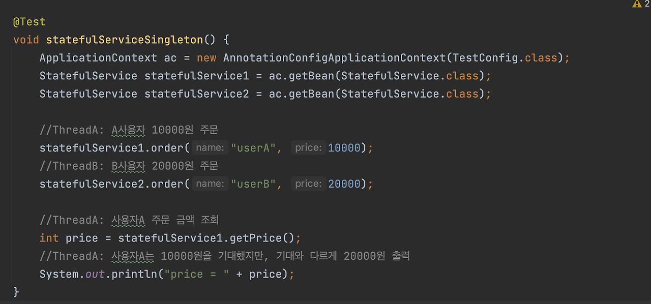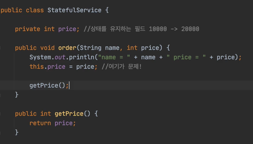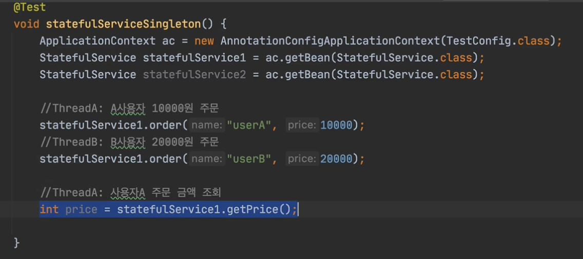 근데 StatefulService의 price 필드는 공유되는 필드란 말이에요. 왜냐면 싱글톤이기 때문이에요. 그런데 특정 클라이언트가 공유되고 있는 필드의 값을 변경한 게 문제예요.