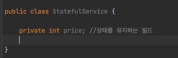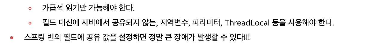 진짜 공유 필드는 조심해야돼요. 스프링 빈은 항상 무상태(stateless)로 설계해야 됩니다.