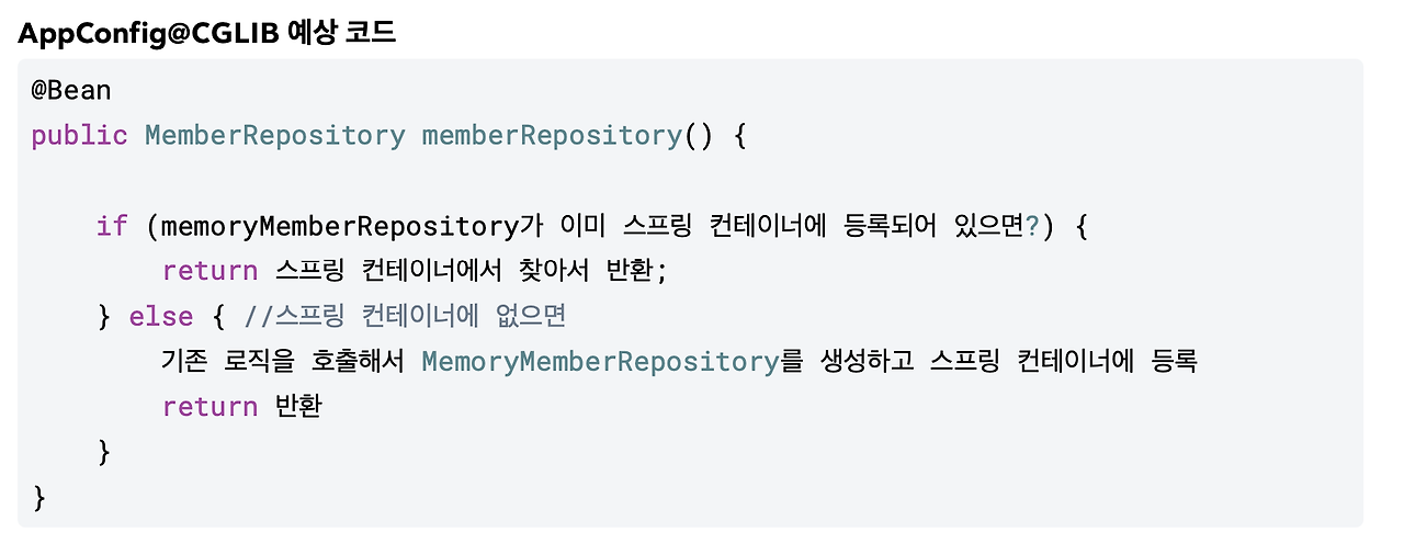이렇게 해서 @Bean이 붙은 메서드마다 이미 스프링 빈이 존재하면 존재하는 빈을 반환하고, 스프링 빈이 없으면 새로 생성해서 스프링 빈으로 등록하고 반환하는 코드가 동적으로 만들어집니다.