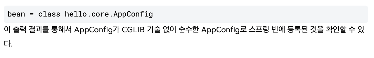 우리가 만든 AppConfig.class 자체는 스프링 빈으로 등록되어 있지 않고, 실제로 등록되어 있는 건 AppConfig@CGLIB 인거죠. 물론, 스프링 빈 이름 자체는 AppConfig 일 겁니다.