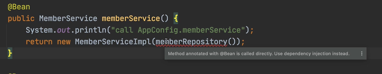 엔터프라이즈 버전에서는 경고를 줍니다. @Bean을 직접적으로 call 했다고 알려줍니다.