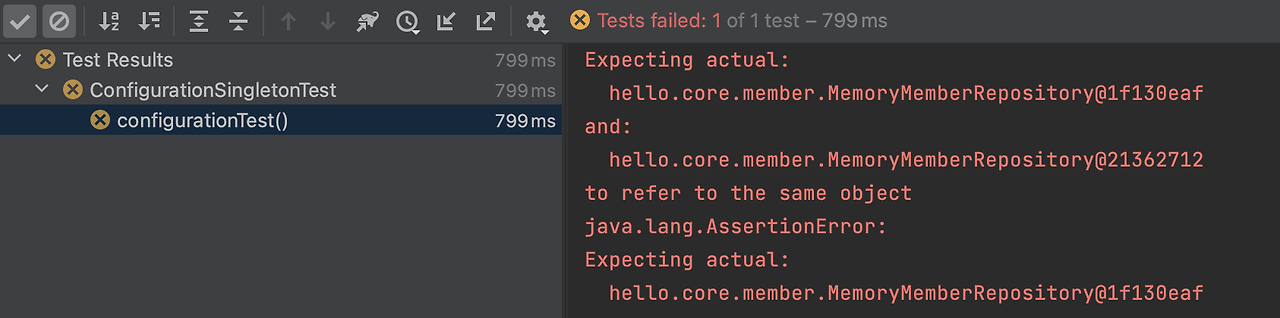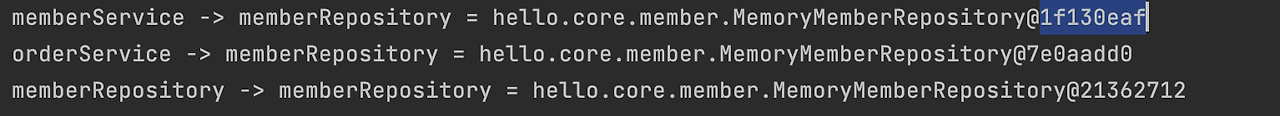 당연히 오류가 생기구요. memberService가 참조하는 MemoryMemberRepository의 주소값과 orderService가 참조하는 MemoryMemberRepository의 주소값이 다른 걸 볼 수 있습니다.