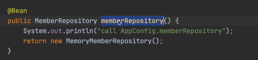 MemoryMemberRepository를 스프링 컨테이너에 등록할 거에요. 그런데 두번째부터는 memberRepository()를 호출을 하면, 오버라이드 된 memberRepository()가 호출이 되는 거죠. memoryMemberRepository가 이미 스프링 컨테이너에 등록되어 있죠? 스프링 컨테이너에서 찾아서 원래 있는 걸 반환을 해주는 거에요.