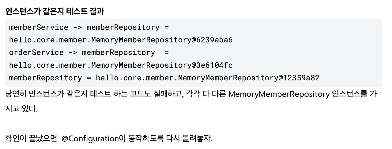 이 출력 결과를 통해서 MemberRepository가 총 3번 호출된 것을 알 수 있죠. 1번은 @Bean에 의해 스프링 컨테이 너에 등록하기 위해서이고, 2번은 각각 memberRepository()를 호출하면서 발생한 코드입니다.