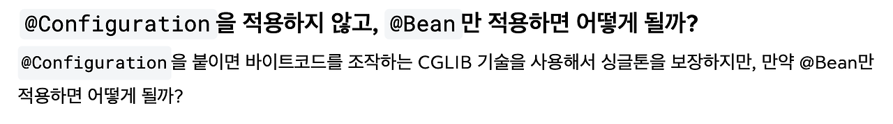 '어? 만약에 @Configuration을 적용하지 않고, @Bean만 적용하면 어떻게 되나요?'