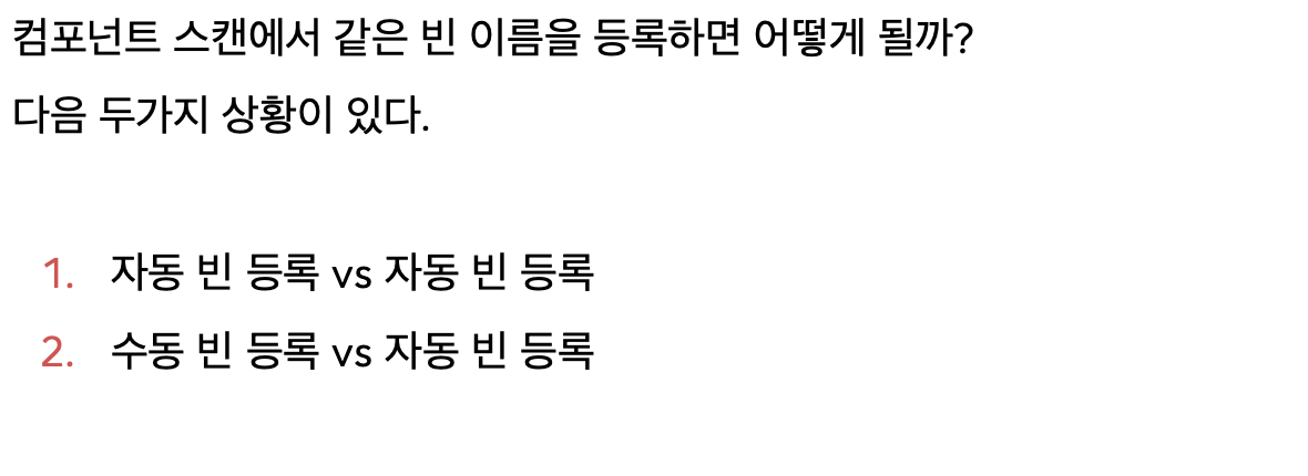자동 빈 등록, 그러니까 둘 다 컴포넌트 스캔한 빈인데 둘 다 이름이 똑같은 거예요. 이게 한 케이스고, 나머지 하나는 수동으로 빈을 등록한 거랑 자동으로 빈을 등록한 게 있어요. 이 경우는 진짜 많이 생기겠죠.