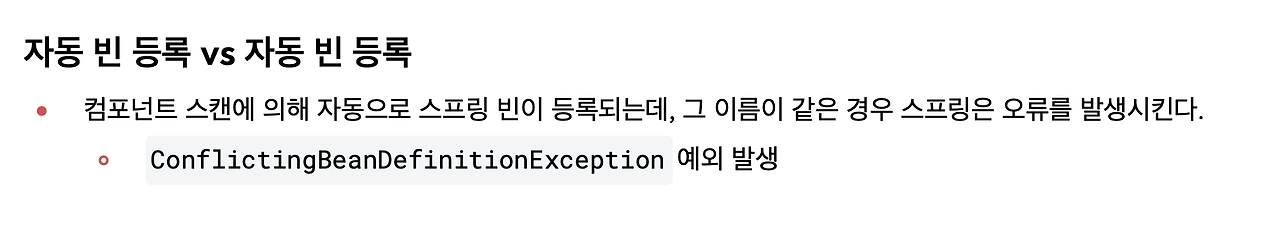 왜냐면 수동으로 해놨는데, 잘못해서 컴포넌트 스캔으로 등록한 거랑 보니까 둘이 똑같은 거예요. 그러면 꽝 충돌이 나겠죠.