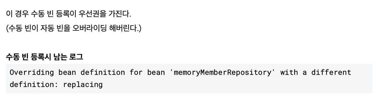 개발 할 땐 명확하지 않은 건 절대 하면 안돼요. 내가 "난 스프링을 너무 잘 알아서 괜찮아. 수동 등록이 우선순위를 갖는 것도 알아!" 그렇다고 해도, 개발은 혼자 하는 게 아니잖아요. 여러 명의 개발자가 같이 하는 거기 때문에 애매한 상황을 만들지 않는 게 가장 중요합니다.