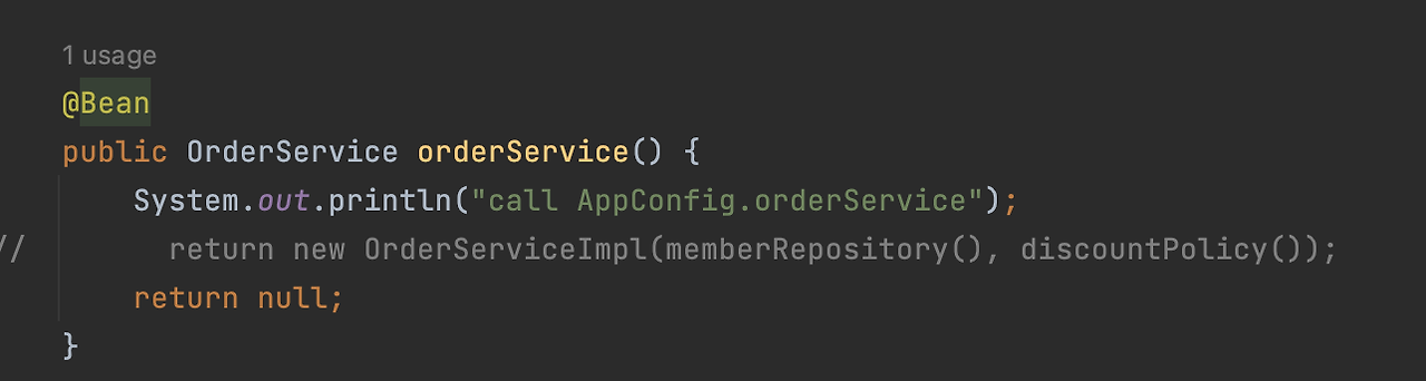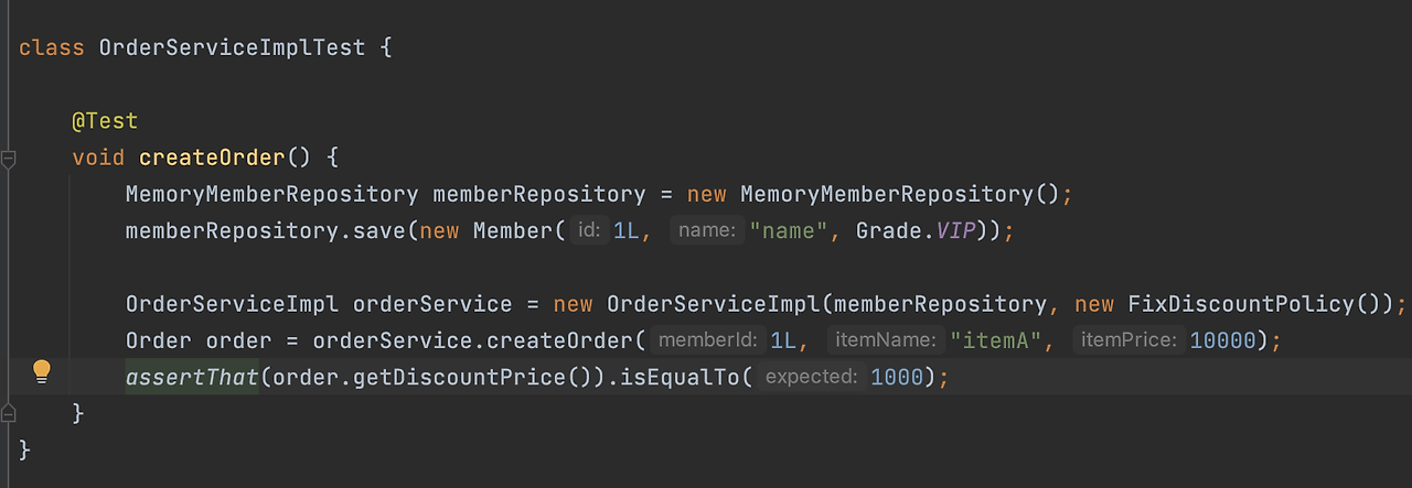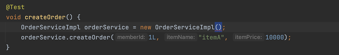 지금 OrderServiceImpl 자체를 잘 만들었는지 테스트 해보는 거예요. 그 다음에 createOrder를 바로 호출해볼게요.