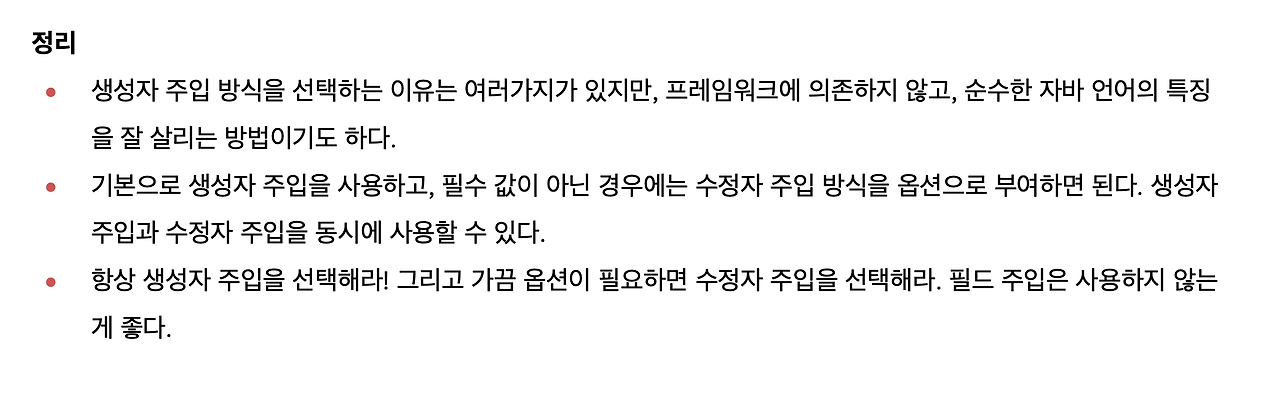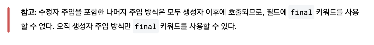 참고로 수정자 주입을 포함한 나머지 주입 방식은 모두, 생성자 호출 이후에 호출되기 때문에 필드에 final 키워드를 사용하는게 불가능합니다. Java 문법인 거죠.