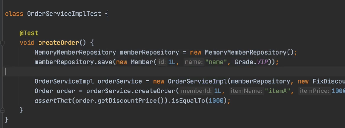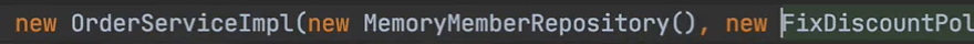 사실 프레임워크 없이, 순수한 Java 단위 테스트 코드를 작성하는 경우가 진짜 많거든요. 이런 게 좋은 테스트에요. 그러니까 스프링을 막 엮고, DB 엮고 이런 테스트도 되게 중요한데, 나는 OrderServiceImpl 자체만 딱 테스트하고 싶은 거에요. 그러면 MemberRepository나 DiscountPolicy 에는 가짜 객체를 주입해서 쓸 수도 있거든요. 아무튼 이건 테스트를 좀 공부하셔야 이해가 되실 수 있는데, 코드를 한번 보여드릴게요.
