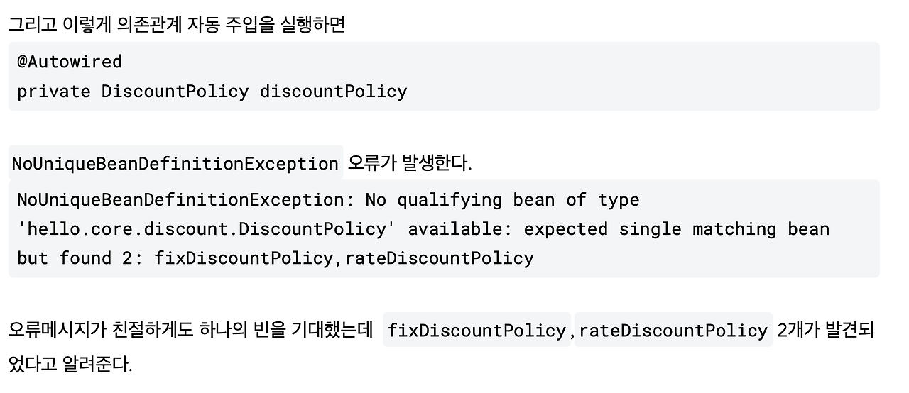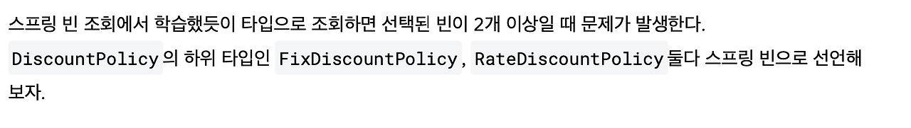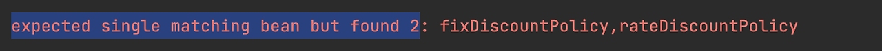 그런데 오류메시지가 친절하게도 하나의 빈을 기대했는데 fixDiscountPolicy, rateDiscountPolicy 2개가 발견되었다고 알려줍니다.