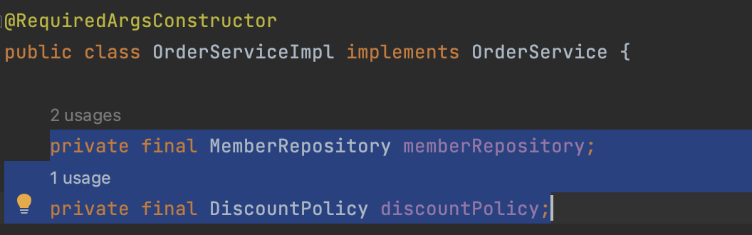 조금 더 쉽게 설명드리기 위해서, @RequiredArgsConstructor를 빼고 생성자를 다시 만들게요.