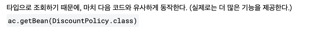 스프링 컨테이너 안에서 Type으로 조회하기 때문에 ac.getBean(DiscountPolicy.class)와 유사해요.