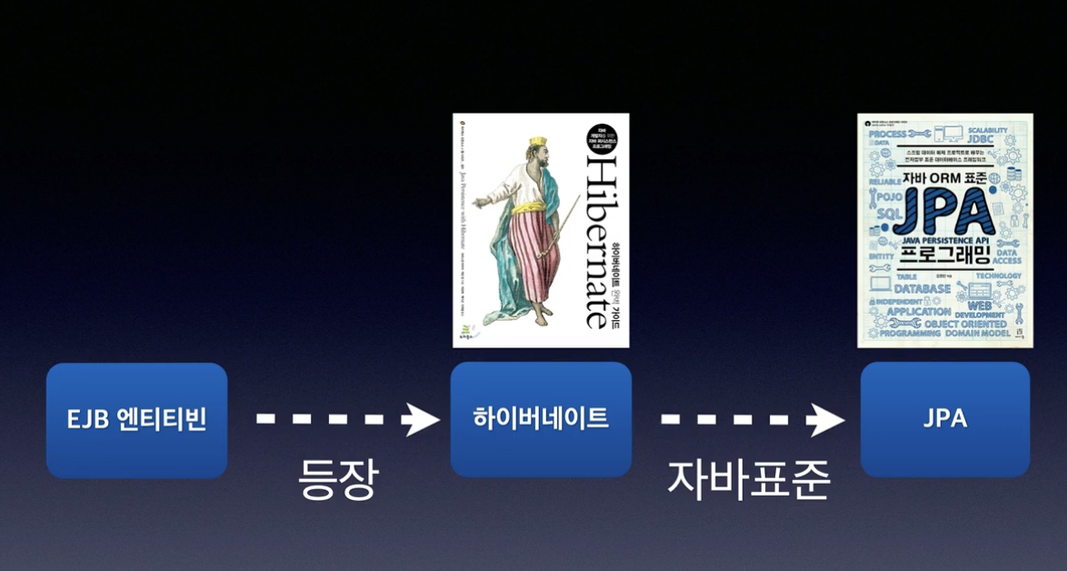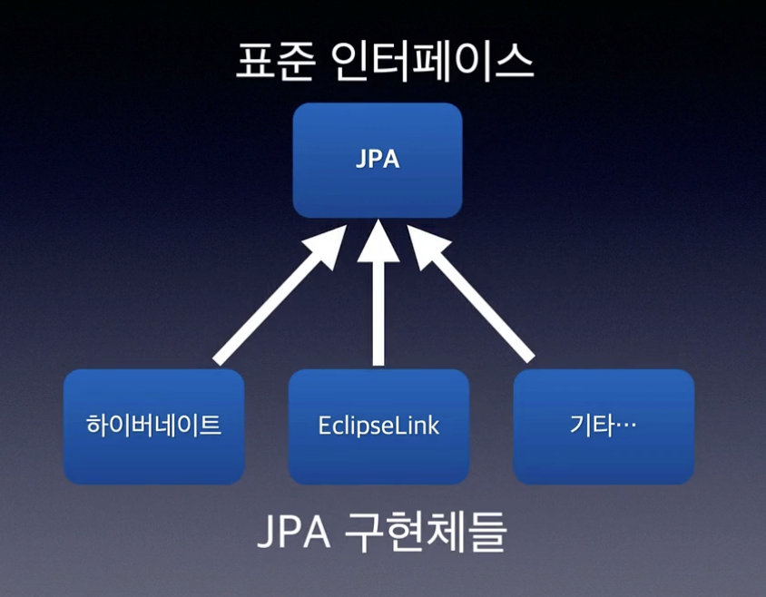 그래서 지금은 JPA라는 표준 인터페이스를 만들고, JPA에 대한 구현체로 Hibernate나 EclipseLink나 다른 벤더들이 만든 기술들이 있다. 대부분 JPA는 표준 Hibernate를 쓰신다고 보면 된다.