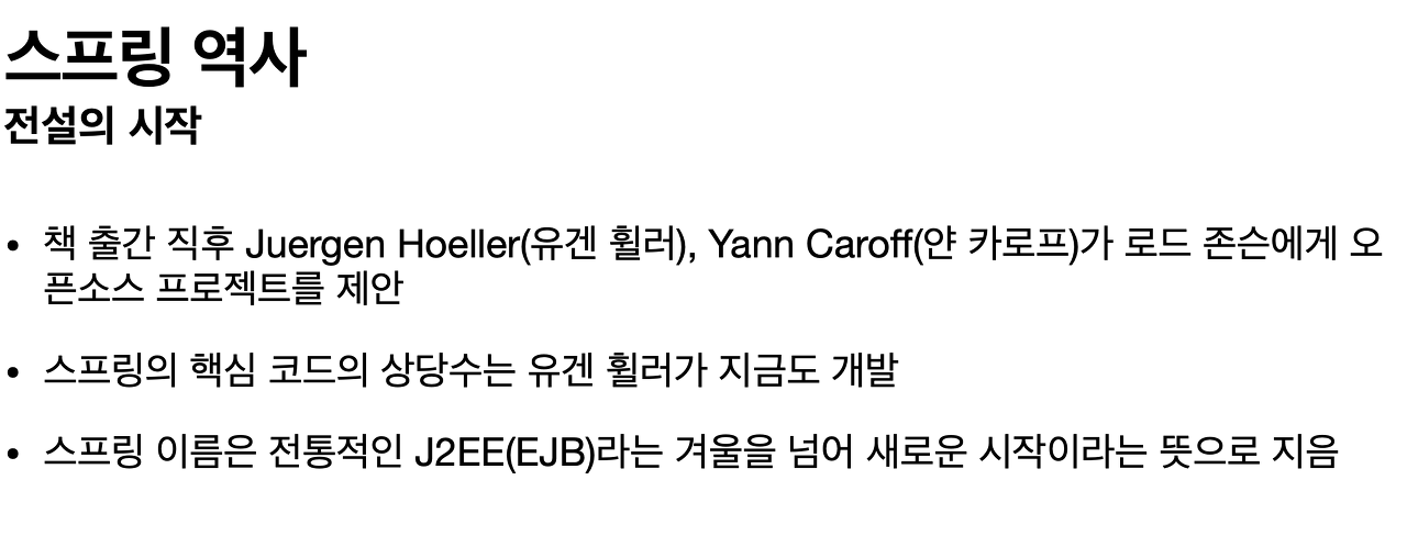 스프링은 2002년에 로드 존슨이라는 개발자가 이 책을 출간하면서 전설이 시작이 됩니다. EJB의 문제점을 쫙 지적을 하면서, EJB가 없어도 충분히 고품질의 확장 가능한 애플리케이션을 개발할 수 있는 것을 보여줘요.
