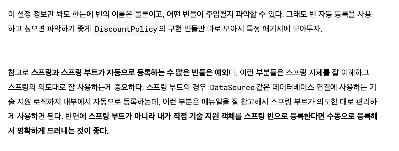 이렇게 하면 설정 정보만 봐도 한눈에 빈의 이름은 뭐고 어떤 빈들이 등록되고 주입될지 파악이 되죠. 그래도 빈 자동 등록을 사용하고 싶으면 파악하기 좋게 DiscountPolicy 의 구현 빈들만 따로 모아서 특정 패키지에 모아두는 게 좋습니다.