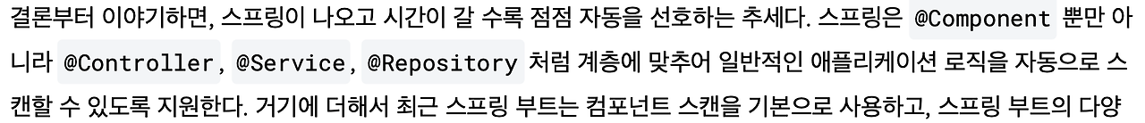 결론부터 얘기하면 스프링이 나오고 시간이 갈수록 점점 자동으로 진화하고 있는 추세예요. 스프링은 @Component 뿐만 아니라 @Controller , @Service , @Repository 처럼 계층에 맞추어서 일반적인 애플리케이션 로직을 자동으로 스캔할 수 있도록 지원해요.