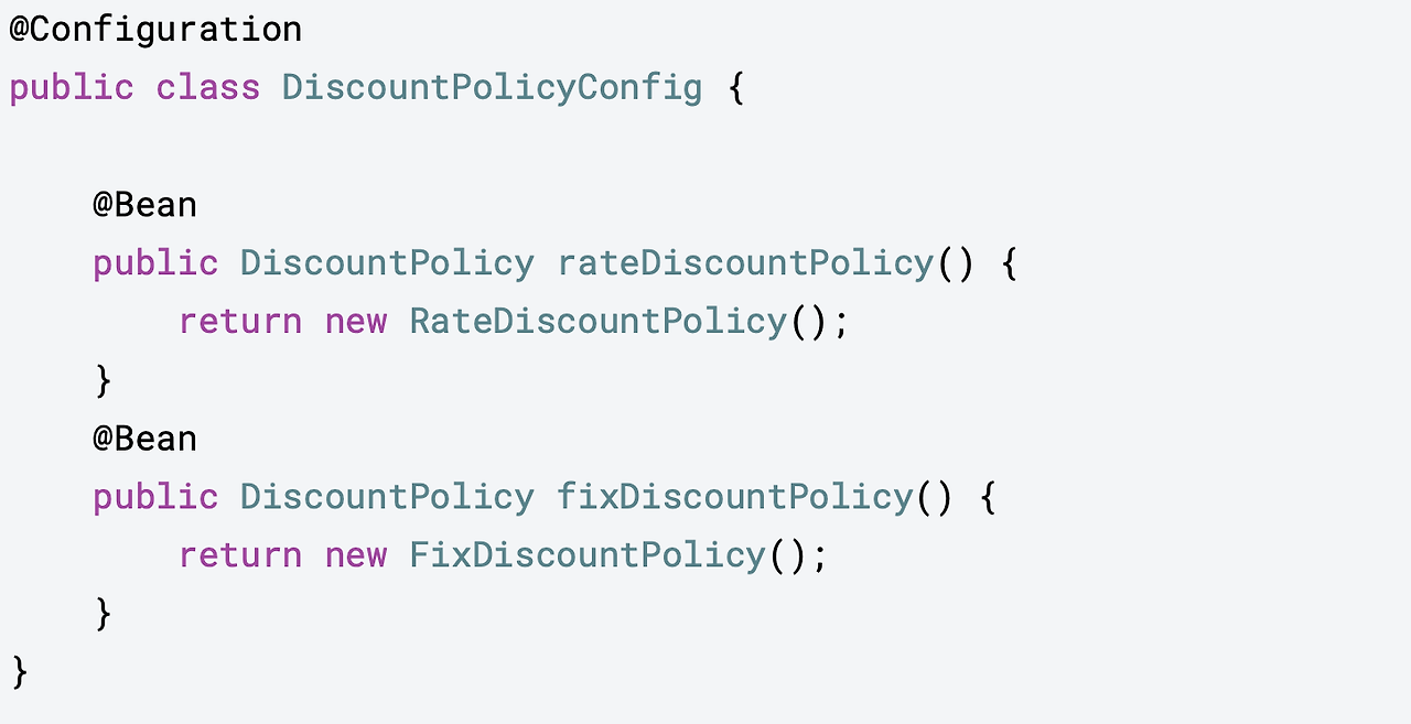 그러면 설정 정보를 만들어서 작업이 돼있으면 "아, 얘네들은 DiscountPolicyConfig 안에서만 무조건 등록을 하고 쓰나보다. 이렇게 두 개가 등록되어 있구나" 라는 게 딱 정리가 됩니다.