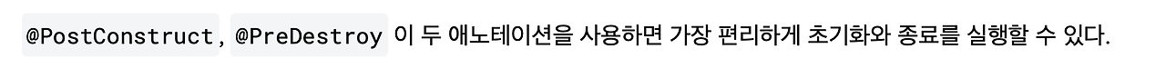 그리고 코드를 고칠 수 없는 외부 라이브러리를 초기화하거나 종료해야 되면, @Bean의 initMethod , destroyMethod 를 사용하면 됩니다. 그리고 destroyMethod같은 경우에는 추론 기능이 있어서 close나 shutdown 같은 이름의 메서드가 있으면 자동으로 호출이 됩니다.