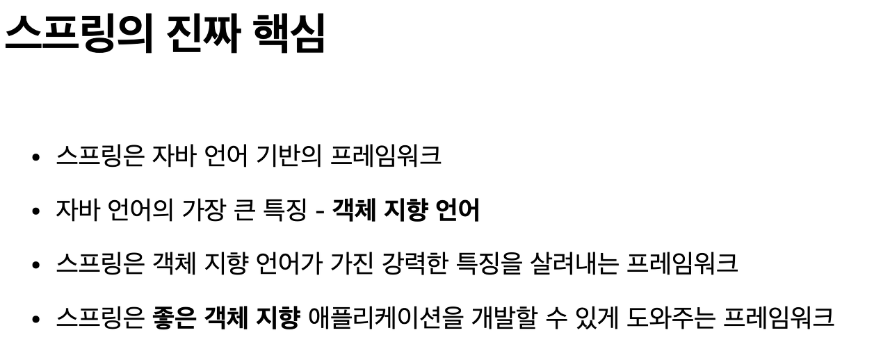 그래서 진짜 핵심은 스프링이 "제대로 된 객체지향 프로그래밍을 할 수 있도록 도와주는 도구" 라는 게 진짜 핵심입니다.