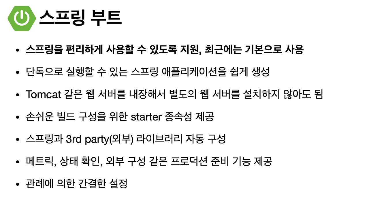 먼저, 단독으로 실행할 수 있는 스프링 애플리케이션을 쉽게 생성할 수 있습니다. 또 톰캣 같은 웹서버를 내장해서 별도의 웹서버를 설치하지 않아도 돼요.