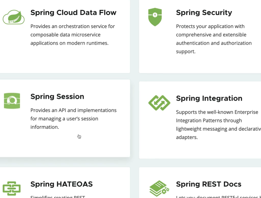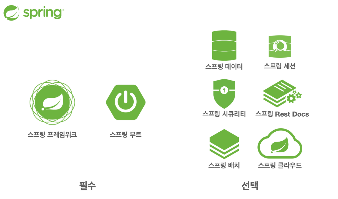 먼저 스프링의 가장 핵심이 되는 스프링 프레임워크, 그리고 여러 스프링 기술들을 굉장히 편리하게 사용할 수 있도록 도와주는 스프링 부트, 그리고 스프링 데이터, 세션, 시큐리티, Rest Docs, 배치, 클라우드 등등등 여러가지가 있어요.