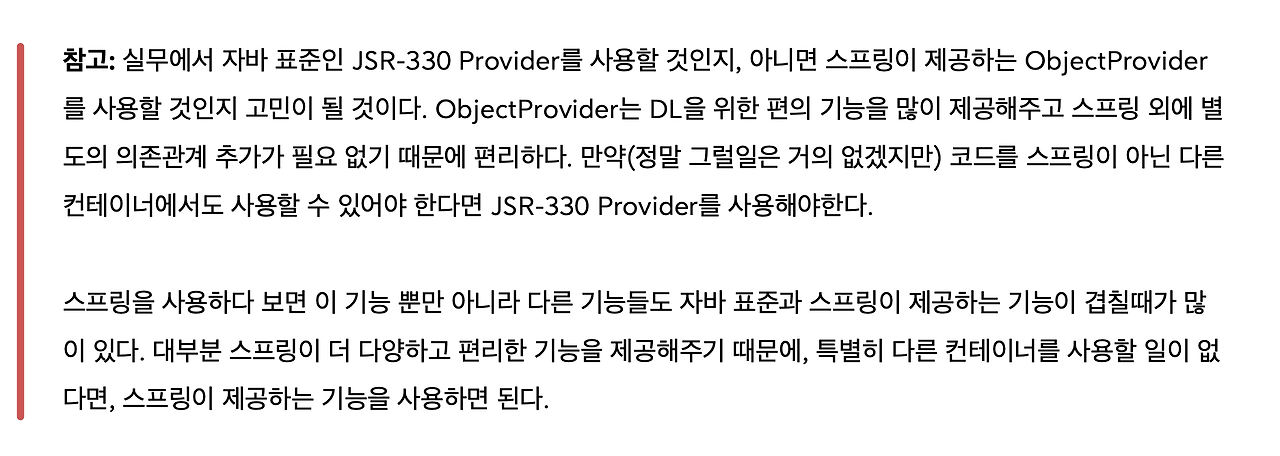 ObjectProvider는 DL을 위한 편의 기능을 많이 제공해주고, 스프링 외에 별도의 의존관계 추가가 필요없기 때문에 편리합니다. JSR-330 Provider처럼 외부 라이브러리를 땡겨오지 않아도 되죠.