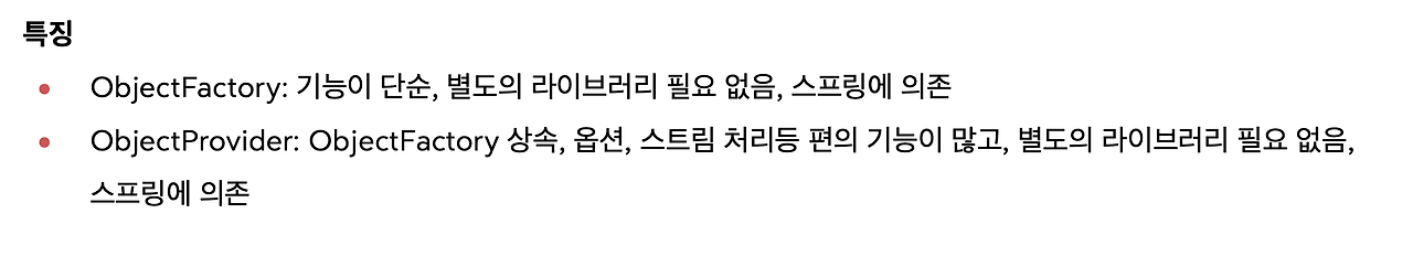 ObjectProvider는 ObjectFactory를 상속받기 때문에 옵션, 스트림 처리 등 편의 기능이 많습니다. 그리고 Java 8의 Optional 같은 거로 할 수 있는 여러가지 컨셉의 기능들이 많습니다.