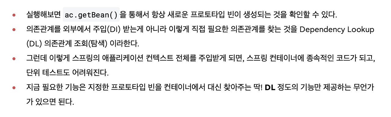 원래는 프로토타입 빈을 의존관계로 주입받았었는데, 지금은 ClientBean에서 필요한 프로토타입 빈을 스프링 컨테이너에서 getBean()으로 직접 찾고 있죠. 의존관계를 직접 찾는 겁니다(DL). 이렇게 찾기만 해도 스프링 컨테이너한테 프로토타입 빈을 달라고 요청하는 거니까, 새로 생성될 겁니다.