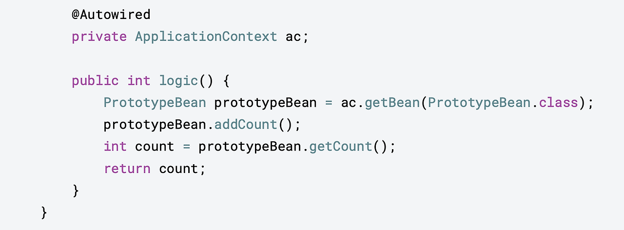 ClientBean이 @Autowired로 ApplicationContext를 주입받아서 logic()에서 prototypeBean의 addCount()를 호출할 때마다 컨테이너에서 프로토타입 빈을 새로 받으면 돼요.